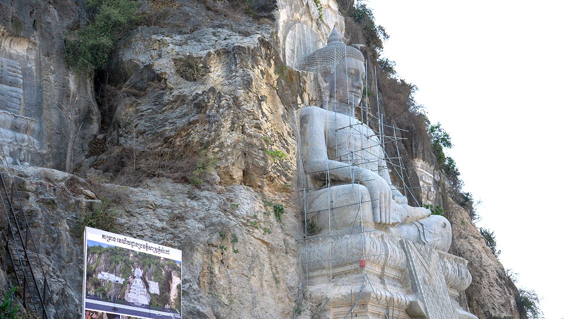 About 15 km before reaching town, the dramatic limestone bluff of Phnom Sampeau rises abruptly from the plains, crowned by a gleaming hilltop pagoda. If you're up for an extra adventure, a climb of 700+ steps will reward you with sweeping views of the countryside below — a fitting finale to a rich day of discovery.