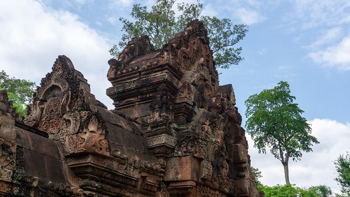 As you arrive at Banteay Srei, be captivated by its exquisite beauty. This temple, carved from soft pink sandstone, dazzles with intricate floral patterns and detailed scenes from the Ramayana epic, showcasing some of Cambodia’s finest ancient artistry.